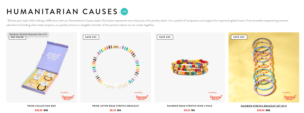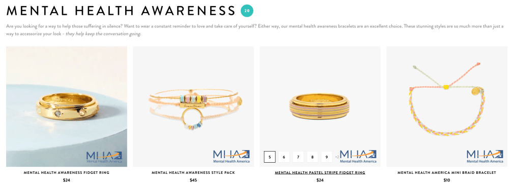 They have different bracelets that support different causes like mental health awareness, suicide prevention, breast cancer, and ocean conservation.