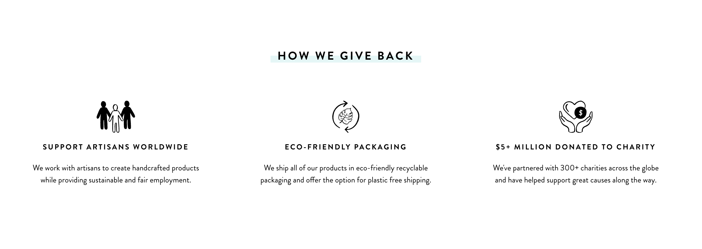Support artisans worldwide, providing sustainable and fair employment. Eco- friendly packaging with option plastic free shipping. In addition, 5+ million dollars were donated to charity.