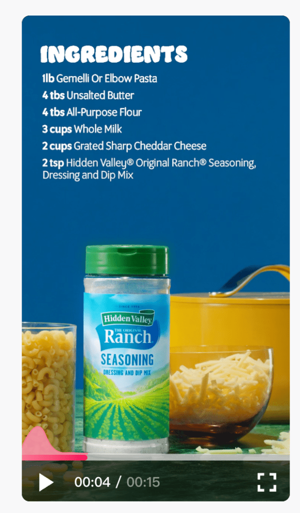 This ad does a great job at telling you exactly what the ad is for right away, all about that Ranch! You know the ad performed well because the second highest performing ad in that category is for the ranch dressing itself. The brand broke down the data and noticed a formating process that helps drives sales and website traffic so why not repeat it for a different product.