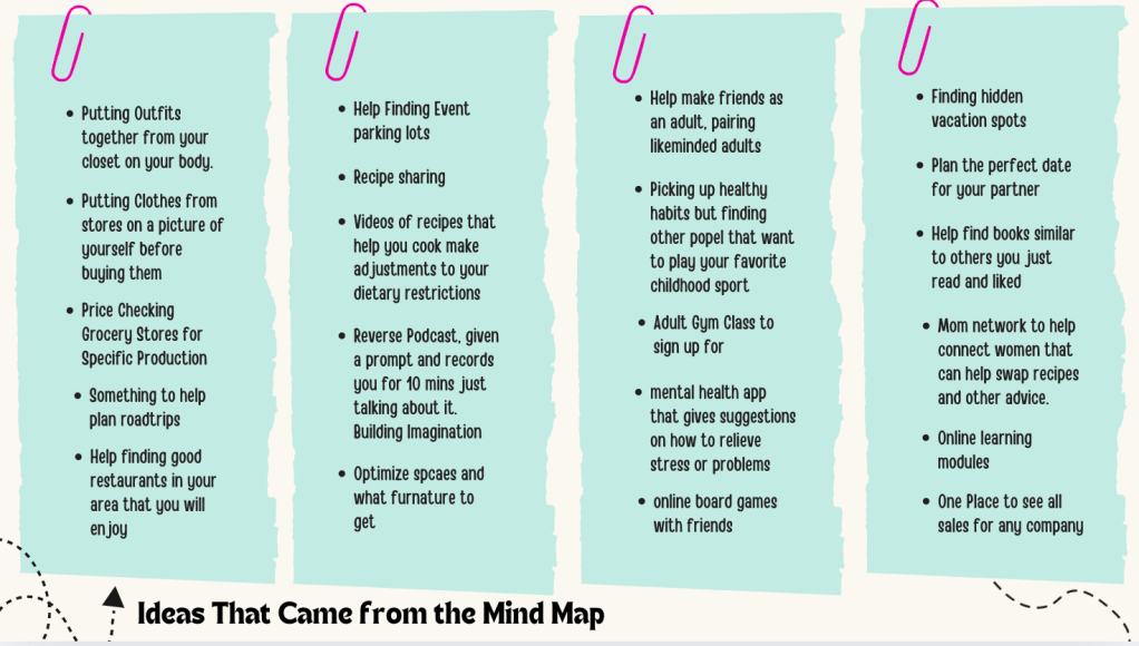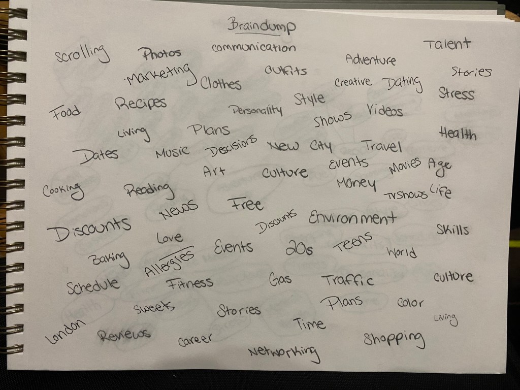 Now that I had a better idea of what I should be looking for, I wanted to get all these thoughts and ideas down on a page. That’s where ideation techniques come in. I first started with the ideation technique called braindump. This is where you give yourself a time limit of about 5-10 minutes to write down all the thoughts in your head. Whatever you can think of. This technique was really good for me to declutter my mind.