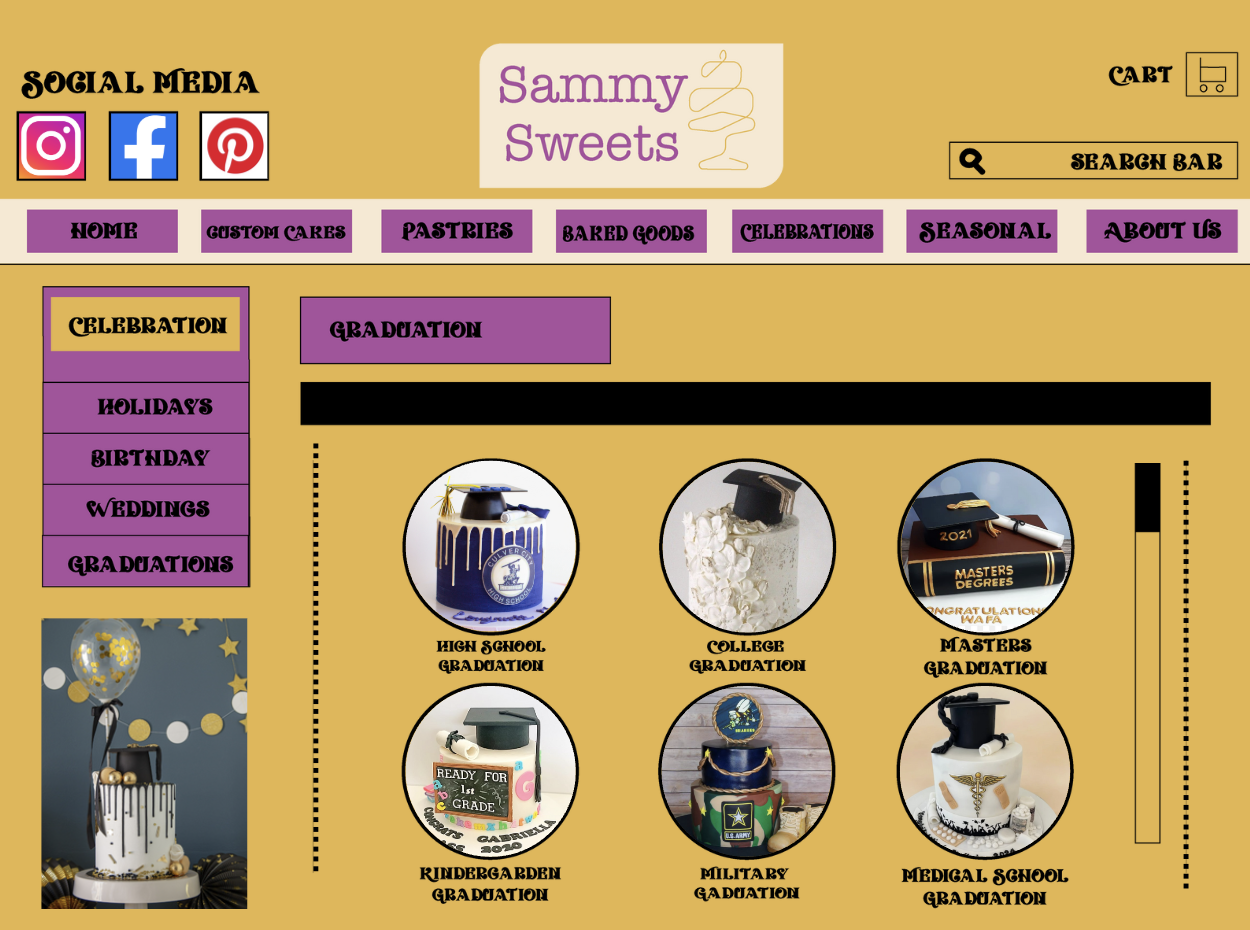 This category is something I thought would help round out this brand. In this category you can pick a out different celebrations and the company has premade ideas that you can choose from. This can make finding a cake a lot easier, and sometime people don’t always want a custom, extravagant cake. Sometimes they just want a basic cake with a graduation cap on top. This would be playing to an audience that might be short on time and budget for a custom cake but still wants to make it a special day.