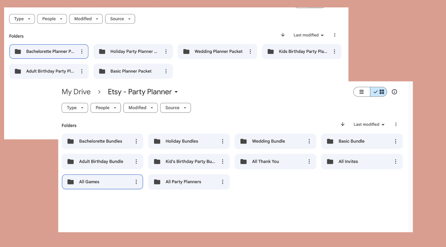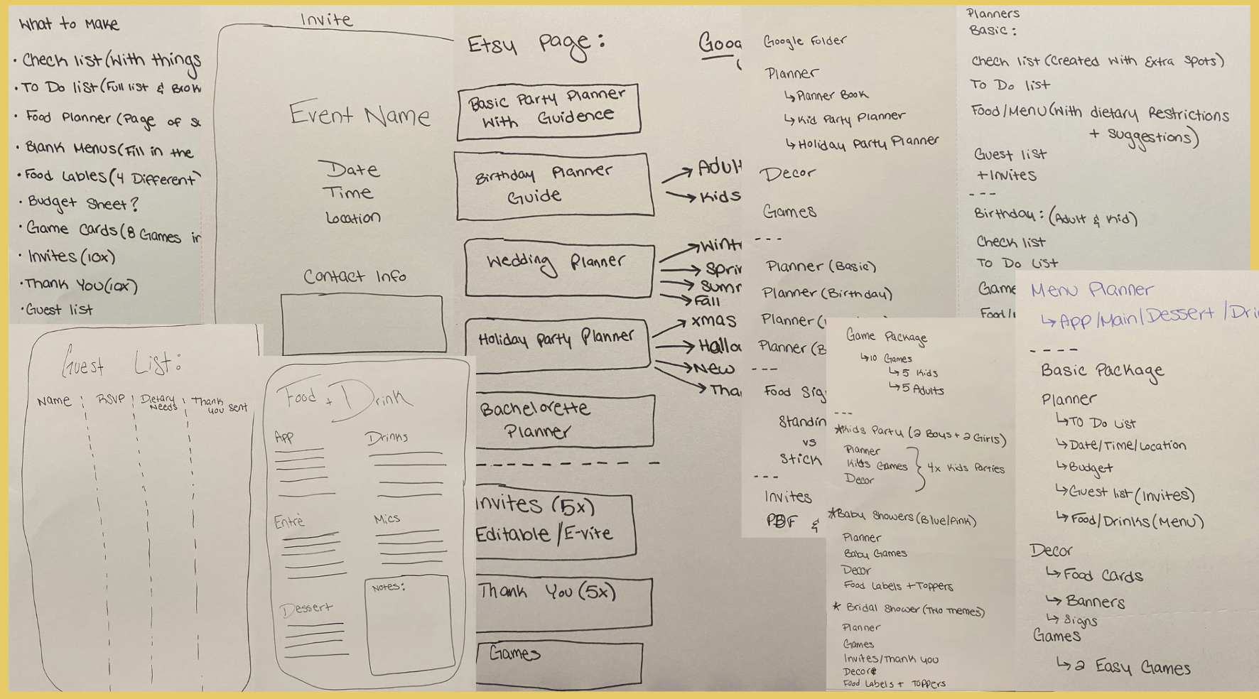 - Digital Folders: I created categories like “Planners,” “Party Games,” and “Mockups.” But halfway through, I started second-guessing. Should I separate things by theme instead of product type? Or by what’s finished versus in-progress? Every time I started a new folder system, I confused myself more. After awhile I thought it would be better to use pencil and paper.