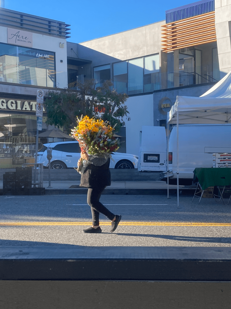 A person crosses the frame wrapped in a large bouquet of bright yellow blossoms that obscure their face. The flowers become the main subject a burst of color that transforms an ordinary walk into a moment of visual poetry.
