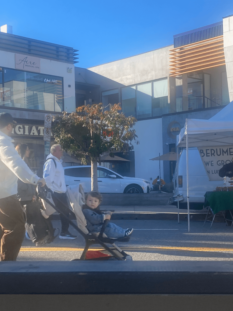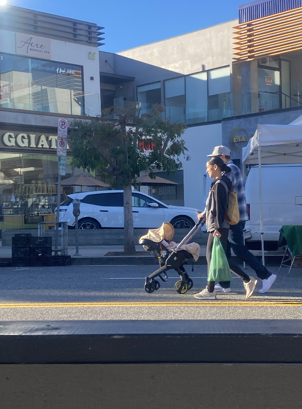 In this frame, the quiet choreography of everyday caregiving becomes a shared gesture rather than an individual one. The two adults move almost in sync, their steps aligned as they guide a stroller down the sunlit street. Nothing monumental happens here and that is precisely where its narrative power resides. The couple’s coordinated pace suggests a partnership built on routine, cooperation, and the soft negotiations of daily life.