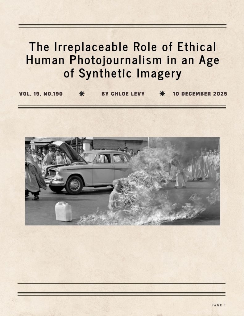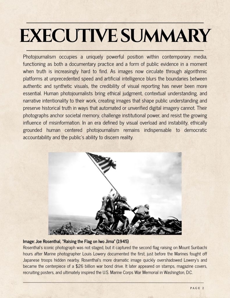 Photojournalism occupies a uniquely powerful position within contemporary media, functioning as both a documentary practice and a form of public evidence in a moment when truth is increasingly hard to find. As images now circulate through algorithmic platforms at unprecedented speed and artificial intelligence blurs the boundaries between authentic and synthetic visuals, the credibility of visual reporting has never been more essential. Human photojournalists bring ethical judgment, contextual understanding, and narrative intentionality to their work, creating images that shape public understanding and preserve historical truth in ways that automated or unverified digital imagery cannot. Their photographs anchor societal memory, challenge institutional power, and resist the growing influence of misinformation. In an era defined by visual overload and instability, ethically grounded human centered photojournalism remains indispensable to democratic accountability and the public’s ability to discern reality.