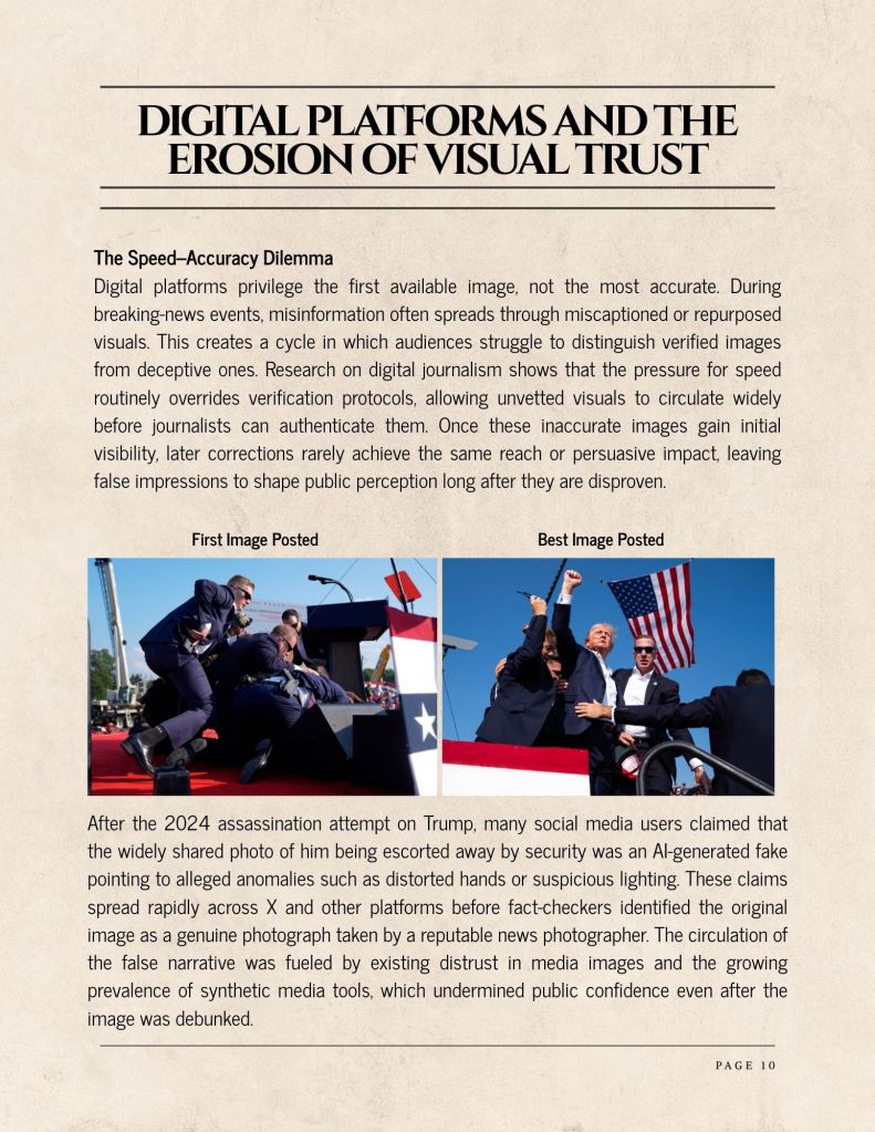 Digital platforms privilege the first available image, not the most accurate. During breaking-news events, misinformation often spreads through miscaptioned or repurposed visuals. This creates a cycle in which audiences struggle to distinguish verified images from deceptive ones. Research on digital journalism shows that the pressure for speed routinely overrides verification protocols, allowing unvetted visuals to circulate widely before journalists can authenticate them. Once these inaccurate images gain initial visibility, later corrections rarely achieve the same reach or persuasive impact, leaving false impressions to shape public perception long after they are disproven.
