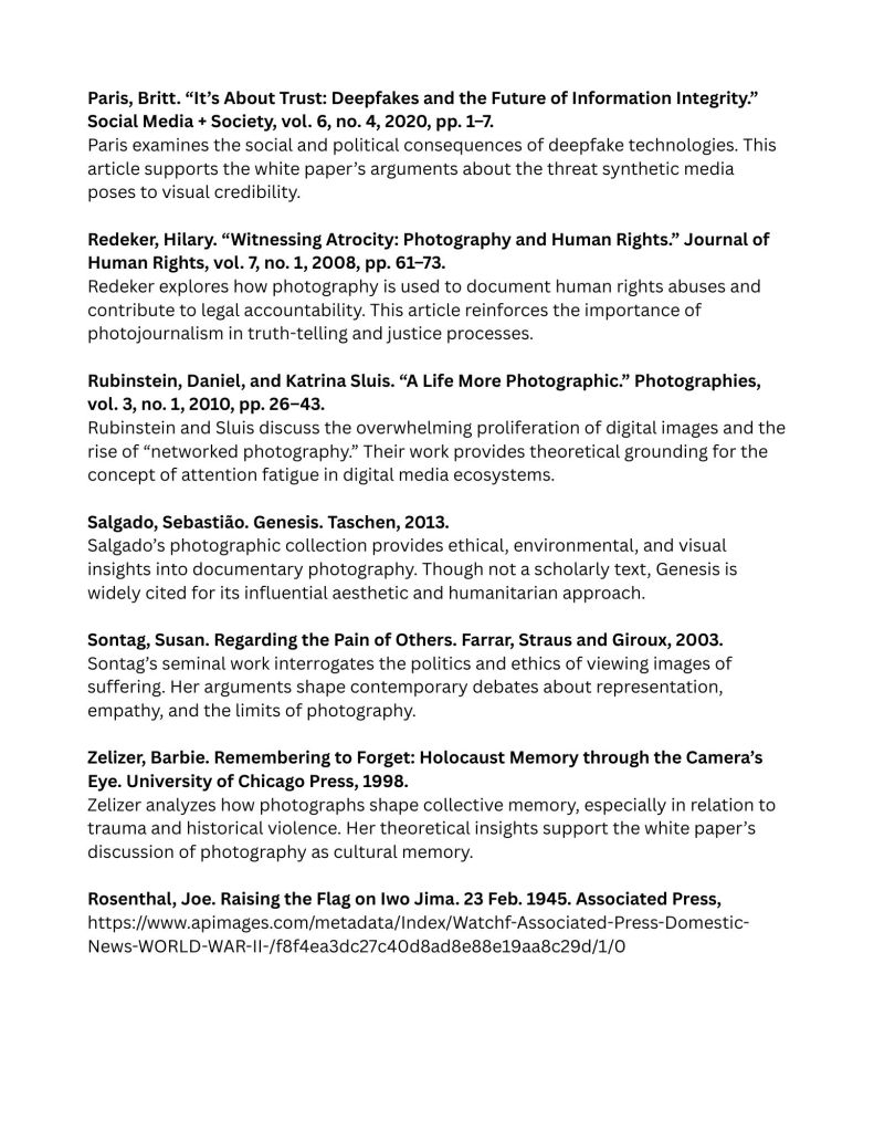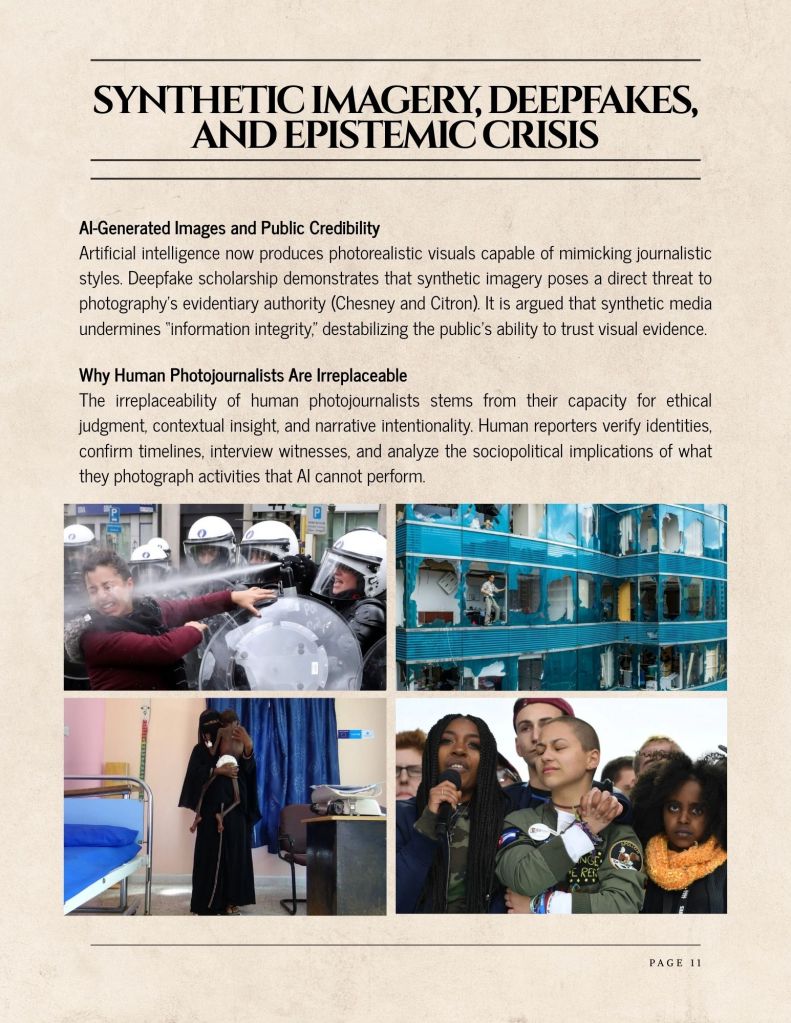 Artificial intelligence now produces photorealistic visuals capable of mimicking journalistic styles. Deepfake scholarship demonstrates that synthetic imagery poses a direct threat to photography’s evidentiary authority (Chesney and Citron). It is argued that synthetic media undermines “information integrity,” destabilizing the public’s ability to trust visual evidence.