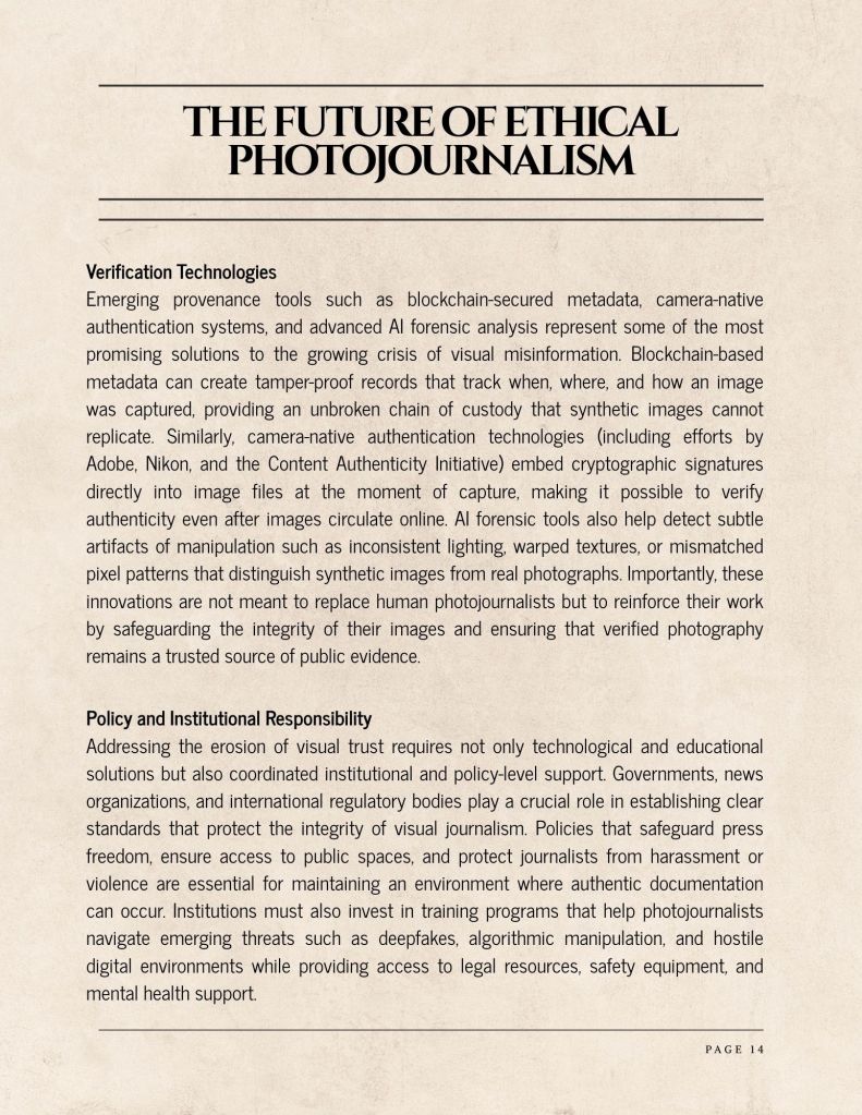 Emerging provenance tools such as blockchain-secured metadata, camera-native authentication systems, and advanced AI forensic analysis represent some of the most promising solutions to the growing crisis of visual misinformation. Blockchain-based metadata can create tamper-proof records that track when, where, and how an image was captured, providing an unbroken chain of custody that synthetic images cannot replicate. Similarly, camera-native authentication technologies (including efforts by Adobe, Nikon, and the Content Authenticity Initiative) embed cryptographic signatures directly into image files at the moment of capture, making it possible to verify authenticity even after images circulate online. AI forensic tools also help detect subtle artifacts of manipulation such as inconsistent lighting, warped textures, or mismatched pixel patterns that distinguish synthetic images from real photographs. Importantly, these innovations are not meant to replace human photojournalists but to reinforce their work by safeguarding the integrity of their images and ensuring that verified photography remains a trusted source of public evidence.