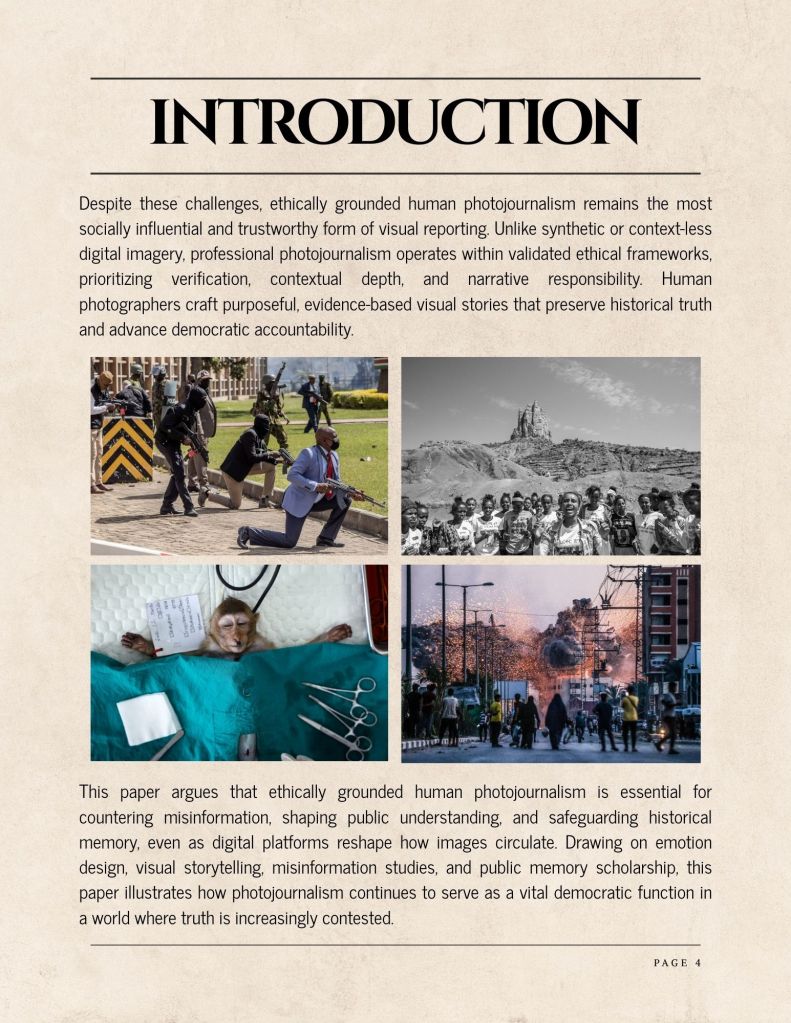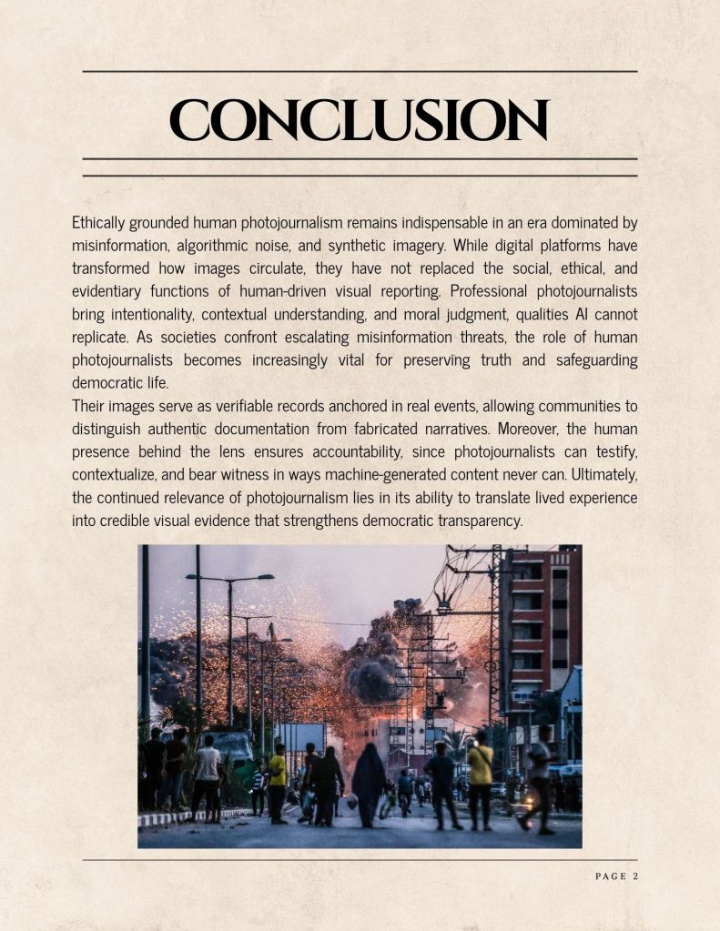 Ethically grounded human photojournalism remains indispensable in an era dominated by misinformation, algorithmic noise, and synthetic imagery. While digital platforms have transformed how images circulate, they have not replaced the social, ethical, and evidentiary functions of human-driven visual reporting. Professional photojournalists bring intentionality, contextual understanding, and moral judgment, qualities AI cannot replicate. As societies confront escalating misinformation threats, the role of human photojournalists becomes increasingly vital for preserving truth and safeguarding democratic life.