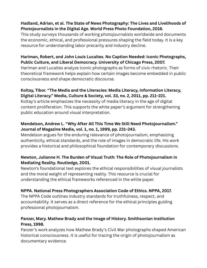 Addressing the erosion of visual trust requires not only technological and educational solutions but also coordinated institutional and policy-level support. Governments, news organizations, and international regulatory bodies play a crucial role in establishing clear standards that protect the integrity of visual journalism. Policies that safeguard press freedom, ensure access to public spaces, and protect journalists from harassment or violence are essential for maintaining an environment where authentic documentation can occur. Institutions must also invest in training programs that help photojournalists navigate emerging threats such as deepfakes, algorithmic manipulation, and hostile digital environments while providing access to legal resources, safety equipment, and mental health support.
