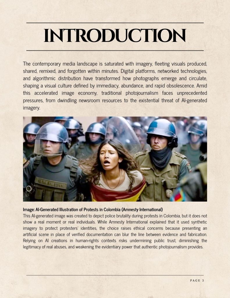 The contemporary media landscape is saturated with imagery, fleeting visuals produced, shared, remixed, and forgotten within minutes. Digital platforms, networked technologies, and algorithmic distribution have transformed how photographs emerge and circulate, shaping a visual culture defined by immediacy, abundance, and rapid obsolescence. Amid this accelerated image economy, traditional photojournalism faces unprecedented pressures, from dwindling newsroom resources to the existential threat of AI-generated imagery.