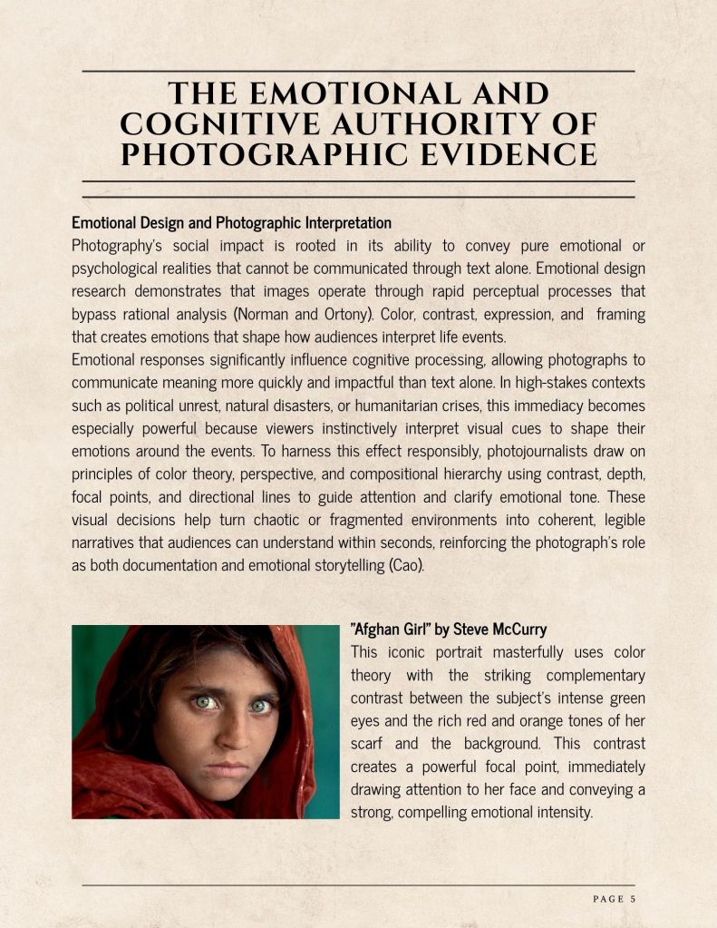 Photography’s social impact is rooted in its ability to convey pure emotional or psychological realities that cannot be communicated through text alone. Emotional design research demonstrates that images operate through rapid perceptual processes that bypass rational analysis (Norman and Ortony). Color, contrast, expression, and framing that creates emotions that shape how audiences interpret life events.