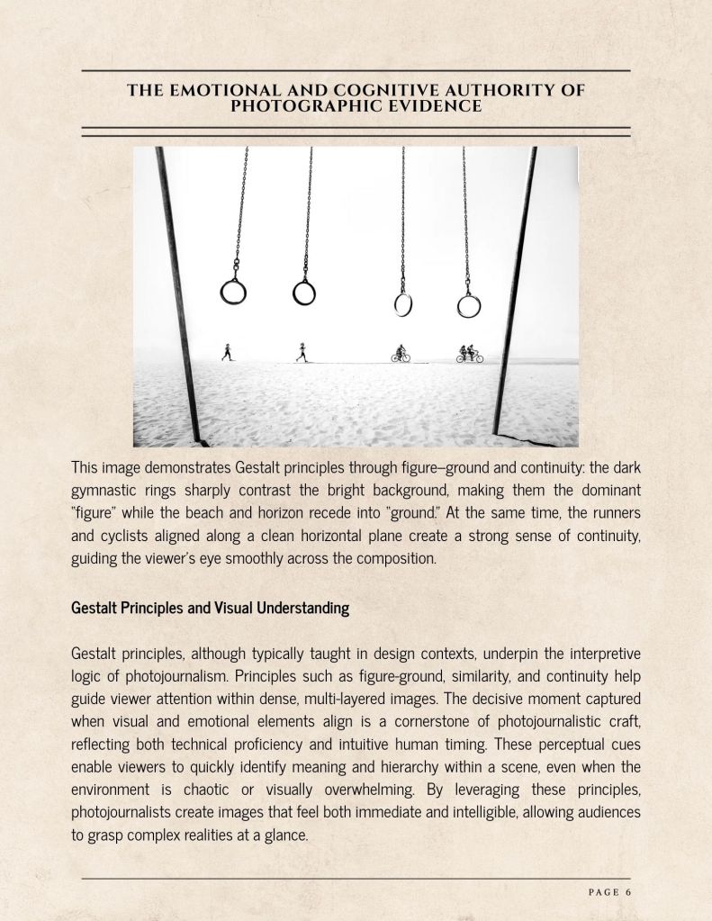 Emotional responses significantly influence cognitive processing, allowing photographs to communicate meaning more quickly and impactful than text alone. In high-stakes contexts such as political unrest, natural disasters, or humanitarian crises, this immediacy becomes especially powerful because viewers instinctively interpret visual cues to shape their emotions around the events. To harness this effect responsibly, photojournalists draw on principles of color theory, perspective, and compositional hierarchy using contrast, depth, focal points, and directional lines to guide attention and clarify emotional tone. These visual decisions help turn chaotic or fragmented environments into coherent, legible narratives that audiences can understand within seconds, reinforcing the photograph’s role as both documentation and emotional storytelling (Cao).