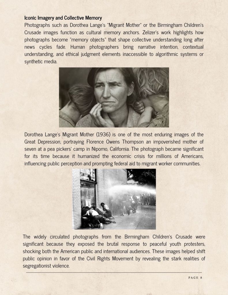 Photographs such as Dorothea Lange’s “Migrant Mother” or the Birmingham Children’s Crusade images function as cultural memory anchors. Zelizer’s work highlights how photographs become “memory objects” that shape collective understanding long after news cycles fade. Human photographers bring narrative intention, contextual understanding, and ethical judgment elements inaccessible to algorithmic systems or synthetic media.