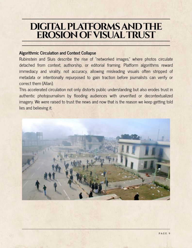 Rubinstein and Sluis describe the rise of “networked images,” where photos circulate detached from context, authorship, or editorial framing. Platform algorithms reward immediacy and virality, not accuracy, allowing misleading visuals often stripped of metadata or intentionally repurposed to gain traction before journalists can verify or correct them (Allan).