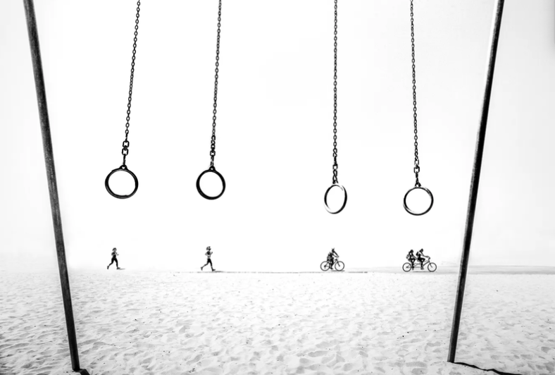 This image below, demonstrates Gestalt principles through figure–ground and continuity: the dark gymnastic rings sharply contrast the bright background, making them the dominant “figure” while the beach and horizon recede into “ground.” At the same time, the runners and cyclists aligned along a clean horizontal plane create a strong sense of continuity, guiding the viewer’s eye smoothly across the composition.